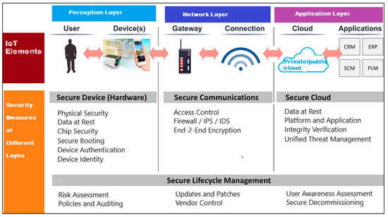 The security of the hardware, firmware and network communications of video surveillance systems can be enhanced by following the guidelines summarized in this section. Preventing attacks against connected devices requires effort from both the industry and users. Vendors must adopt good practices for built-in security measures, such as secure remote access, basic encryption, and patching all known vulnerabilities [39,40,41,42,43,44,45,46,47]. Without proper safeguarding, IP-connected cameras are vulnerable to hacking, which can lead to the compromise of millions of security cameras and video recorders. The security mechanisms that can be used to prevent different types of attacks is tabulated in Table 3. To protect from security attacks, the security measures that are suitable at different layers (perception layer, network layer and application layer) are summarized in Figure 6.
