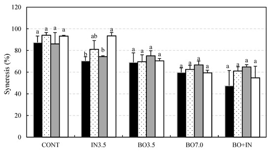 Syneresis (%) of kefir-fermented soymilk supplemented with inulin and/or bocaiúva powder-pulp at 1 (black bar), 6 (dots), 11 (gray), and 16 (white) days of shelf storage. CONT, without adding ingredients; IN3.5, with the addition of 3.5% inulin (m/v); BO3.5, with the addition of 3.5% bocaiúva powder-pulp (m/v); BO7.0, with the addition of 7.0% bocaiúva powder-pulp (m/v); and BO + IN, addition of 3.5% inulin + 3.5% bocaiúva powder-pulp. Different letters indicate a statistical difference between the fermented beverages during the shelf life by the Tukey test (p < 0.05).