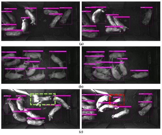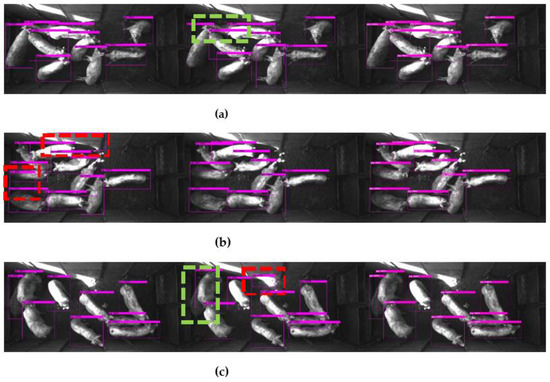 Figure 7 shows the result of solving the failed detection cases for each model using the model ensemble. In the case of Figure 7a, while false negatives were created that resulted in missing pig detection in model B, all of the pigs within a frame detected through the model ensemble are shown. In the case of Figure 7b, while false positives were created that resulted in the detection of background as pig in model A, all of the pigs detected through the model ensemble that merged with falsely detected boxes are shown. In addition, Figure 7c shows false negatives and false positives created in model B, which were merged using a model ensemble that correctly detected all pigs within a frame. Hence, even if falsely detected boxes were created from each model, enhancing the detection result of each model and further merging the result using the model ensemble was possible.