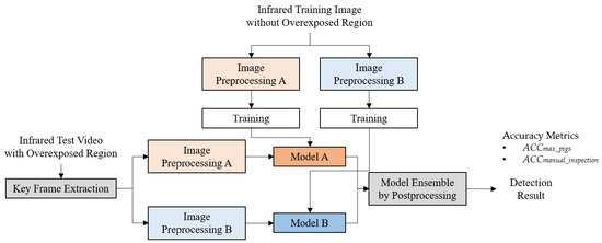This study proposes a solution to the problem of decreasing accuracy caused by overexposed regions with strong sunlight by applying image preprocessing to images that are not exposed to strong sunlight. In addition, a model ensemble method of combining detection results using the detection boxes of two models to improve detection accuracy is proposed, along with a method for extracting key frames that have effective movement in a test video and new accuracy metrics that measure accuracy, without additional box-level annotation cost. The entire structure of the proposed method is shown in Figure 3.