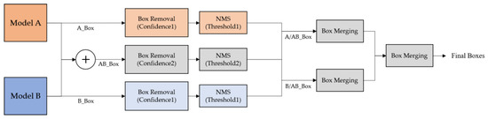 Although the model ensemble can increase accuracy, it also increases the execution time. Therefore, this study proposes a model ensemble method using information from the detection box of two models at the post-processing level to increase detection accuracy. Initially, a union (AB_box) of the detection box set is acquired from model A and model B using two sets, A_box and B_box, which are sets of detection boxes from models A and B, respectively. After boxes with a lower confidence score for each set of boxes in A_box, B_box, and AB_box are removed, non-maximum suppression (NMS) is performed for each set. The thresholds for confidence and NMS are set differently with a set of model boxes, A_box and B_box, and a union set of model box AB_box, for diversity. For example, the boxes from set A_box and B_box can be removed aggressively (in Figure 4, Confidence1 and Threshold1 are set to high and low, respectively), whereas the boxes from set AB_box can be removed conservatively (in Figure 4, Confidence2 and Threshold2 are set to low and high, respectively). The effects of diverse combinations of thresholds are explained in Section 4. After the NMS process, the NMS results of A_box and AB_box are combined as A/AB_box using the box merging algorithm (explained later), and the NMS results of B_box and AB_box are combined as B/AB_box. Finally, the detection boxes of A/AB_box and B/AB_box are combined as final boxes, using the same box merging algorithm. Hence, this method merges the detection boxes produced from two models in two steps, with a union set of the model box, to maximize the effect of the model ensemble. The overall structure is shown in Figure 4.