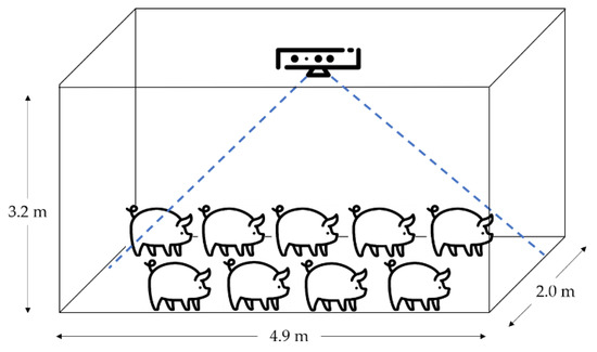 The experiment was conducted in a 3.2 m tall, 2.0 m wide, and 4.9 m long pigsty at Chungbuk National University, and a low-cost Intel RealSense camera (D435 model, Intel, Santa Clara, CA, USA) [37] was installed on the ceiling to obtain the images. A total of nine pigs (Duroc × Landrace × Yorkshire) were raised in a pig pen, and the average initial body weight of each pig was 92.5 ± 5.9) kg. Color, infrared, and depth images were acquired using a low-cost camera installed on the ceiling, and each image had a resolution of 1280 × 720 at 30 frames per second (fps). Figure 5 shows a pig pen with a camera installed on the ceiling. To exclude the unnecessary region of the pig pen, the region of interest (RoI) was set to 608 × 288.