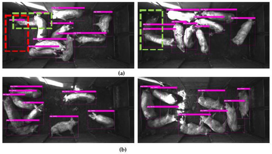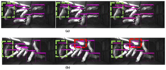 Limitations of ACCmax_pigs when max_pigs = 9. (a) An “error” frame with one false-positive error and one false-negative error based on ground-truth (although it is regarded as a “correct” frame based on ACCmax_pigs); (b) a “correct” frame with no false positive/negative error based on ground-truth (although it is regarded as an “error” frame based on ACCmax_pigs).