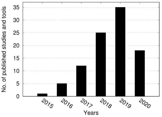 To widely cover the current literature, we considered studies published in five multidisciplinary electronic bibliographic database including IEEE, ACM, Springer, Elsevier, and ScienceDirect. Since the blockchain technology is recently become popular, it started to be used for supply chain management in last decade. Wherefore, we considered articles published from 2015–2020. Even though, we found more than 30,000 blockchain related studies, we selected top 150 studies that matches our search criteria in Table 1. Downloaded articles were critically examined based on the research questions and related abstracts, and half of the papers were excluded in this phase. During full-text screening and Snowball sampling, 20 more papers are eliminated. Backward and forward selection is performed on references of the remaining 55 papers, identifying 7 more potential papers. In addition to research articles and thesis, 29 web-reports and industrial tools are pointed out in this study. Figure 1 shows the number of studies considered from each year, from 2015 to 2020.