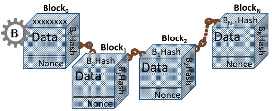 Blockchain is a distributed and decentralized database system that keeps records into numerous digital blocks by forming an unbreakable and immutable chain between them, as shown in Figure 3. Each block is uniquely identified by its hash-code, which is generated by a one-way cryptographic hash function using block-data. A cryptographic hash function assures large unpredictable change in the hash-code with a single bit alteration in the block-data. Each new block stores the hash-code of the previous block, along with its actual data, to form a chain. Summarising, a single block stores four types of information i.e., (1) a hash-code of the previous block, (2) the actual data records that may be transactions data like date and time, amount, quantity, and the participants’ information (e.g., buyer and seller’s digital signatures), (3) the nonce, and (4) the hash-code of the current block, produced by applying hash function on the hash-code of the previous block, the nonce, and the transaction data. Thousands of transactions of more than 1MB can be stored in a single block (https://www.blockchain.com/charts/avg-block-size accessed on 20 May 2021)). Number of blocks in a blockchain is called the height of the blockchain.