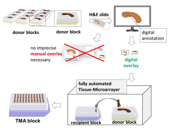 Since Battifora introduced the method of the ‘multitumor (sausage) tissue block’ in 1986 [1] and Kononen developed the Tissue MicroArray (TMA) in 1998 [2], the advancement of this technique has shown continuous progress. With the TMA method, it is possible to process several hundred tissue samples simultaneously and under identical conditions (incubation time, temperature, concentration of reagents) [3]. Further advantages include cost and time efficiency [2,3,4,5,6], evaluation under identical conditions [3,5,6,7,8] and preservation of donor specimen [2,7,9,10,11,12]. The combination of digital microscopy to select regions to punch using Digital Image Analysis (DIA) with fully automated tissue microarrays have led to the development of a new era in TMA technique and coined the term next-generation Tissue MicroArray (ngTMA®) [11,13]. This technique is based on TMA planning, design including digital pathology and performing an automated tissue microarray. Therefore, a much higher accuracy is expected when compared to conventional TMA, where selection and punching are done manually [13,14]. Objective accuracy analyses become possible through the usage of digital microscopy and comparison of digitally set annotations with the finished digital TMA slide (Figure 1). The establishment of ngTMA® has also facilitated inter-institutional research [14,15]. Standard TMA methods require high expertise [14,16], can be accompanied by loss of antigenicity [16,17] and the loss of tissue cores [18,19]. In addition, the informative value of a minuscule tissue punch when compared with whole slide analysis remains disputed [6,15,19,20,21,22,23]. Therefore, assessment of qualitative accuracy of ngTMA® has focused on determining how representative a punch core on a TMA is compared with a whole slide in immunohistochemical evaluation. Hence, there is advice on the number or diameter of cores for different tissue types such as breast cancer [20,23], pulmonary cancer [15], colorectal cancer [24] and endometrial cancer [19]. By following these recommendations, a greater accuracy of the ngTMA® approach is assumed [11,13,14,24].