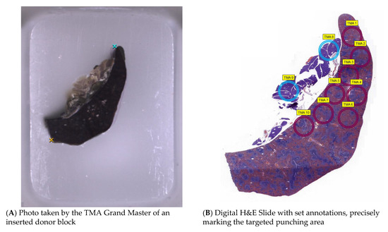 For TMA construction, the TMA Grand-Master® (3DHISTECH Ltd., Budapest, Hungary) was loaded with up to 12 recipients and up to 60 donor blocks according to the manufacturer’s instructions. Photos of all inserted donor blocks were taken, and a digital overlay was conducted by aligning the previously annotated digital slide to the picture of each corresponding donor block (Figure 2).