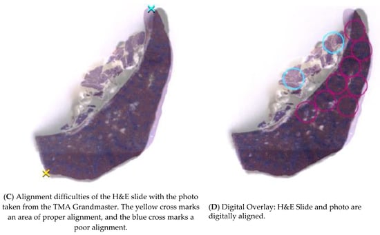 Digital Overlay and Alignment. Shown is the digital overlay and alignment using a photo taken by the tissue microarrayer and the digitalised H&E slide with the previously set annotations marking the targeted punching area. (A) picture taken by the TMA Grandmaster of an inserted donor block. The two crosses mark the uppermost und lowermost border of the tissue. (B) Digital H&E Slide with set annotations. It is possible to choose different colours for each target area. (C) Overlay of the H&E slide with the photo taken from the TMA Grandmaster and demonstrates the sometimes-occurring alignment difficulties. The yellow cross marks an area of proper alignment, and the blue cross marks a poor alignment. (D) Digital Overlay after alignment of the H&E Slide and photo with previously set annotations.