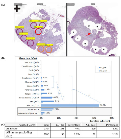 Correlation of core Loss and tissue type. (A) H&E slide of a donor block on the left side before and on the right side after the punching procedure. Punched areas (*) and one core loss (arrow) on a renal specimen. (B) Core loss is shown in correlation to the different tissue types in percent. CL_pre shows the core loss before and CL_post the core loss after manual replacement of dispatched tissue cores. There is a strong significance (p < 0.001, Chi-Square), indicated with **, when comparing skin tissue to the other tissues and a significant difference (p < 0.01), indicated with *, when comparing the Renal medulla and A&V-tissue with the renal cortex, myocard and spleen tissues. (C) The table contains the total number and the percentage of core loss.