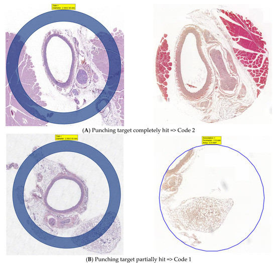 For this purpose, qualitative accuracy was defined as the concordance between the digitally set annotation and the corresponding core on the TMA slide. According to the hit of the punching target, the classification used was ‘completely hit’, ‘partially hit’ or ‘missed’. This definition is comparable to established classification in the literature [5,13]. To analyse the quantitative accuracy, deviations of target structures were metrically measured.