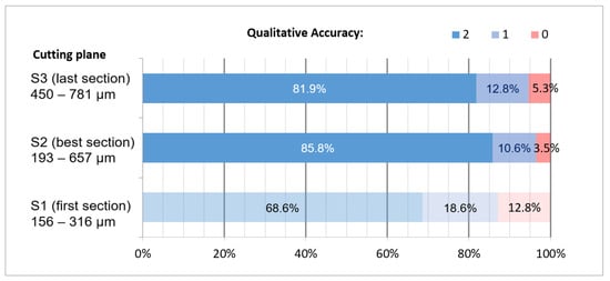 The results are depicted in Figure 7. In all three planes, the graph peaks at around 200 µm. Close to 90% of slides had a deviation below 500 µm (Figure 7B). Figure 7C shows the distribution of the accuracy in the different sectional planes. In the plane S1: 53.8%, 93.2% and 96.2% of all measured deviations were below 200 µm, 400 µm, and 500 µm, respectively.