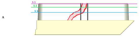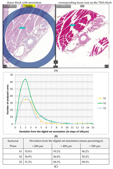 When studying the accuracy of the digitalised ngTMA® method, it is crucial to consider that the TMA block is a three-dimensional structure. The depth of the retrieved section determines the location and shape of the targeted structure (Figure 6A). To analyse the accuracy of cutting depth, the block was cut to a mean depth of 441 µm from S1 so that approximately two-thirds of the block remained for further research. Three slides were selected to represent three different sectional planes.