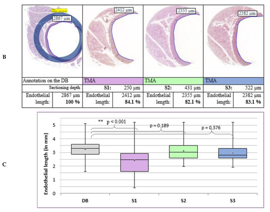 Another metric parameter used to quantify accuracy was the measurement of the endothelial length of the aorta. The length of the aortal lumen on the annotated donor block was compared to the TMA slides in the different sectional planes (Figure 6). In total, 270 slides were examined. Figure 6C shows the results when comparing the range of the endothelial length measured in the annotation, with the variety of measurements of the endothelial length in the different sectional planes in the TMA slides. The best results were detected in planes S2 and S3. The mean endothelial length in the annotations was 3.22 mm. In the sectional planes S1, S2 and S3, the mean endothelial lengths were 2.40 mm, 3.10 mm, and 2.96 mm, respectively.