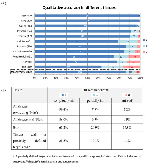 Qualitative Accuracy in different tissues. (A) The diagram shows different soft tissues depending on the qualitative punching accuracy in correlation to the punch specification. The numbers 2, 1 and 0 in the legend stand for ‘completely hit’, ‘partially hit’ or ‘missed’ punch specifications. The bar labelling denotes the respective number of punch cores. The bar width shows the percentage of cores. (B) Overview of the main results presented in (A) to investigate qualitative accuracy.