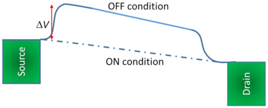 In some specific cases, such as a field–effect–transistor, we may be able to derive a relation between the energy dissipation/energy–delay product and the error probability. Consider the conduction-band diagram in the channel of an n-channel field–effect–transistor along the direction of drain current flow as shown in Figure 1. In the OFF state, there is a potential barrier at the source–channel junction which prevents electrons in the source contact from entering the channel and turning the transistor ON. This barrier has to be lowered by the applied gate potential ΔV in order to allow electrons to enter the channel when the transistor has to be turned ON. Therefore, this barrier should be approximately equal to the quantity . It is clear then that the transistor can spontaneously turn ON while in the non-conducting state (causing a switching error that results in a bit error), if electrons can enter the channel from the source by thermionic emission over the barrier. The probability of entering the channel in this fashion, which is roughly , is then the switching error probability p. From Equation (2), we then get that the energy dissipation can be written as: