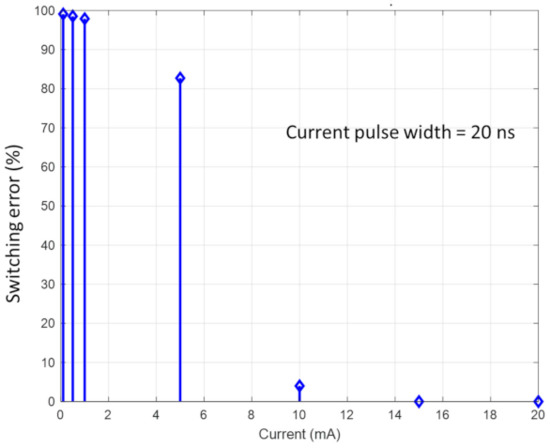 In our s–LLG simulations, we considered six different switching currents of 0.5, 1.0, 5.0, 10.0, 15.0 and 20.0, corresponding to current densities of A/m2, A/m2, A/m2, A/m2, A/m2 and A/m2, respectively. We generated 1000 switching trajectories for each current by solving Equation (10). We start with the initial condition and ran each trajectory for 20 ns with a time step of 0.1 ps. After 20 ns, each trajectory ended with a value of either close to +1 (switching success) or −1 (switching failure). The error probability is the fraction of trajectories that resulted in failure.