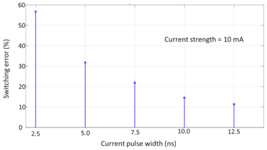 In Figure 4, we show the error probability as a function of switching time (pulse width of the injected current) for a fixed magnitude of the current. The current strength chosen for this plot was 10 mA. In this simulation, we turned off the current after different intervals of time and continued the simulation for 20 ns to see whether the value of my ended up close to +1 (success) or −1 (failure). Again, the simulation duration of 20 ns was sufficient to ensure that for each simulated trajectory, my ended up close to either +1 (success) or −1 (failure) at the end of the simulation. One thousand switching trajectories were generated for each pulse width, and the error probability is the fraction of trajectories that result in failure. We observe that the error probability decreased with increasing current pulse width (longer passage of current, or slower switching), as expected.