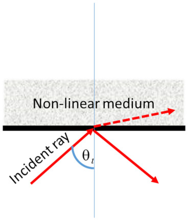 Consider a ray incident from a linear medium onto a non-linear medium at an angle θl. If the angle of incidence exceeds the critical angle for this pair of media, the ray suffers total internal reflection. Otherwise, it is refracted into the non-linear medium. The critical angle is given by the expression: