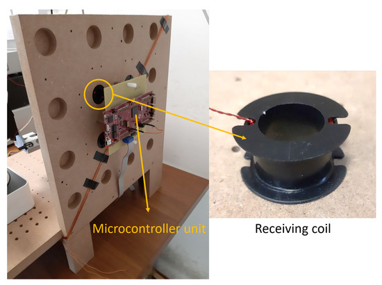 Rear view of the yz plane of the magnetic positioning system. Receiving coils inserted into carved slots are visible, together with the microcontroller unit acquiring the signal on four receivers.