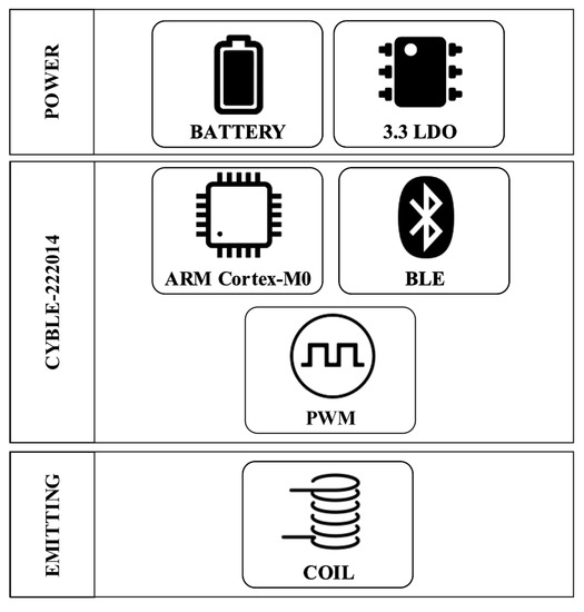 Each transmitting node can be programmed to generate a unique coil excitation frequency in a predetermined range. A ready-to-use integrated solution based on the PRoC (Programmable Radio-on-Chip) CYBLE-222014 by Cypress Semiconductor [40] was selected to minimize the overall node size. The device is based on an ARM Cortex-M0 processor and integrates into a small form factor of 10 × 10 mm a number of components needed for its operations like crystal oscillators, antenna chip and passive elements. CYBLE-222014-01 supports several peripheral functions, such as analog-to-digital converters, timers, counters, and Pulse Width Modulators (PWM), as well as serial communication protocols (I2C, UART, and SPI) through its programmable architecture. CYBLE-222014-01 includes a royalty-free BLE (Bluetooth low Energy) stack compatible with Bluetooth 4.2 and provides up to 16 general purpose input/outputs (GPIOs) and has 256 KB of memory. The peripherals used for the expected functionality of the transmitting node are: BLE stack, PWM, timers, clock dividers and GPIO.
