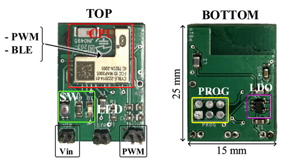 Figure 5 shows the block diagram of the transmitting node. The first block is the power supply section. The wearable device has been designed to be battery powered; however, multiple power sources are supported due to the presence of a fixed 3.3 V voltage regulator (TSP71533 by Texas Instruments) that permits obtaining a stable supply for a wide range of input voltage: 3.75–24 V. The second block is the core of the device represented by CYBLE-222014 with its internal used peripherals. The PWM peripheral is configured to produce an output voltage signal with a frequency in the range 149.47–210.53 kHz with 500 Hz steps, the duty-cycle being fixed at 50%. The output of the PWM device is connected directly to the coil to set the square wave, at the desired frequency. The printed circuit board (PCB) has been designed using EAGLE Autodesk software for schematic, routing and Gerber extraction (Figure 6a). The result is a 2-layer PCB whose dimensions are 25 × 15 mm (Figure 6b).