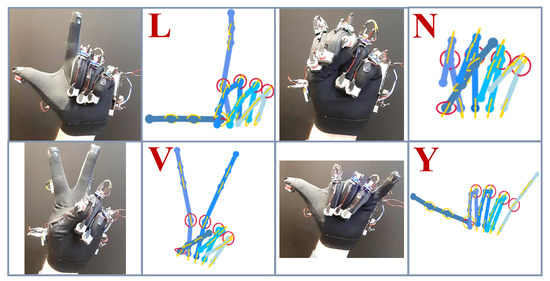 Some examples of letters articulated while wearing the glove, and their respective reconstructions obtained through the kinematic model.