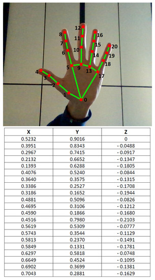 An example of the hand model reconstructed by MediaPipe Hands is shown in Figure 10, which also lists the 21 hand landmarks for the detected hand. Each of these landmarks represents a three-dimensional coordinate: x and y assume values in the [0, 1] range and they correspond to the position of the pixel in the image, normalized with respect to image width and height, while z represents the distance from the palm. Smaller values of z are linked to closer points to the camera. The scaling factor chosen for the z coordinate is roughly the same as the one used for the x coordinate.