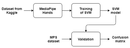 Our workflow started with the selection of a high-quality dataset for the ASL alphabet letters from Kaggle. Kaggle is a subsidiary of Google LLC that provides a platform as a service for data science purposes. It allows users to write, store and execute code written in Python and R. Due to its extensive collection of machine learning libraries and packages, we decided to use Python as the programming language. We used the implementation of SVM provided by the Scikit-learn library and, instead of approaching the classification problem as a computer vision problem, we used the ready-to-use and efficient Python solutions offered by MediaPipe as prebuilt Python packages.