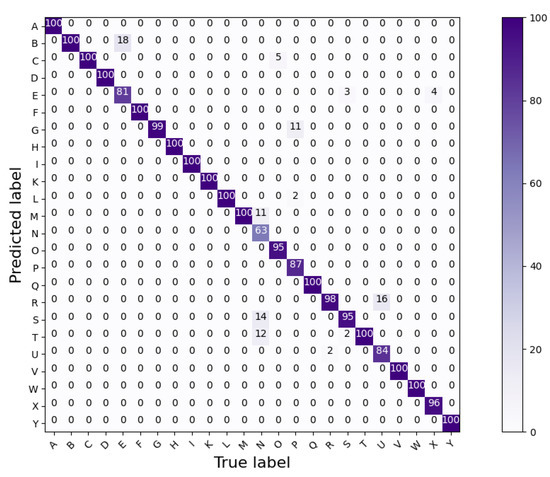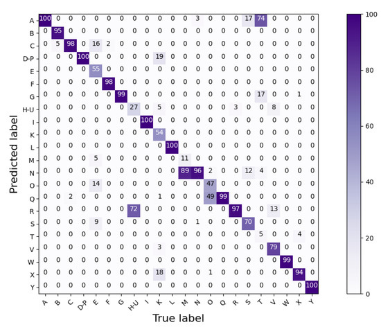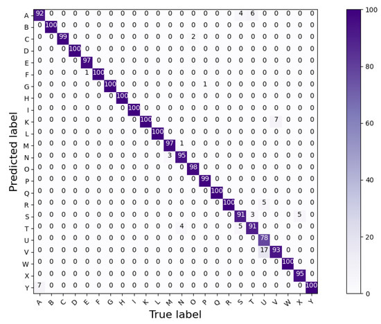 The results obtained by Model A, Model B, and Model C are shown by the confusion matrices in Figure 12, Figure 13 and Figure 14, respectively. Furthermore, a summary of the classification accuracy achieved by the three considered models on data acquired by the signers individually and on the global MPS dataset is provided by Table 5. The global dataset is built by combining data of all three signers.