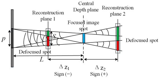 where Δz is the defocused depth, and p is the hogel size and is equal to NΔx2. The value of Δz is negative if z is smaller than L, and it is positive if z is greater than L. The first term in Equation (4) is indicated by the green rectangle and the second term is indicated by the red rectangle in Figure 2. The first term is related with imaging while the second term is caused by defocusing. Substituting Equation (2) into Equation (4), we can get: