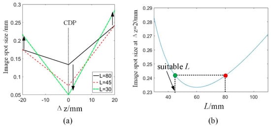 Assuming the parameters are L = 80 mm, f = 3 mm, Δx1 = Δx2 = 5 μm, λ = 500 nm, the relationship between image spot size S and defocused depth Δz is drawn by the black solid line in Figure 3a. It can be seen that at the CDP, the image spot has the minimum size. As |Δz| increases, the image spot size also increases, resulting in a degraded resolution. To enhance resolution, we try to reduce L to 30 mm, which is shown by the green dash-dotted line. The resolution at the CDP is greatly improved, but at |Δz| = 20 mm, the resolution is degraded, indicated by the upward arrow. Thus, the resolution is enhanced at a price of decreased depth range. This case can be avoided by choosing a proper L. As shown by the red dashed line with L = 45 mm, the resolution at the CDP is improved compared with L = 80 mm. In addition, at |Δz| = 20 mm, its image spot size just equals that of L = 80 mm. It means that the resolution is enhanced within the total depth Δz, without the price of decreased depth range. It is just the limiting case as mentioned above, with an appropriate L. The suitable value of L can be found by a numerical method. Figure 3b shows the relationship between L and image spot size at Δz = 20 mm. First, the image spot size with L = 80 mm can be obtained, represented by the red point. Then, a horizontal line starting from the red point is generated, and it intersects with the curve to form a green point. The x-coordinate of the green point is just the proper value of L.