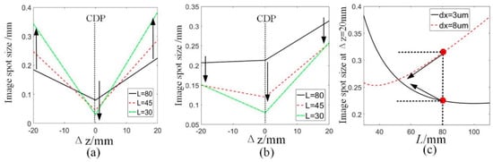 However, the proper value of L cannot be found at any situation. Figure 4a shows the case with the same parameters as Figure 3 except for Δx1 = 3 μm. It can be seen that reducing L will always decrease the resolution away from the CDP, indicated by the upward arrows. On the contrary, Figure 4b shows the case with Δx1 = 8 μm. It can be seen that reducing L will always enhance the resolution within the total depth range, indicated by the downward arrows. These two results can be easily understood in Figure 4c, which shows the relationship between L and image spot size at Δz = 20 mm. In the case of Δx1 = 3 μm, represented by the black solid line, reducing L will cause the increase of the image spot size at the marginal depth, which means reducing L will always cause decreased depth range. Constrastingly, in the case of Δx1 = 8 μm, represented by the red dashed line, reducing L will cause the decrease of the image spot size at the marginal depth, which means reducing L is always effective. In both cases, the proper value of L cannot be found using the method in Figure 3b.