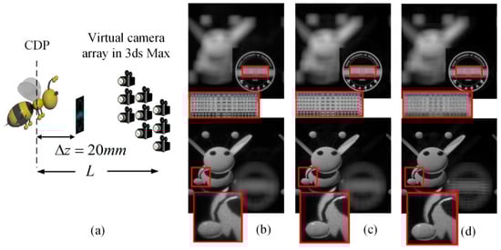 Increasing focal length f will decrease the image spot size near the CDP, resulting in better reconstruction quality. However, according to Equation (2), increased f will cause increased pixel number N of EI. That is, both sizes of hogel and EI increase and cause wider light rays, making larger defocused spots away from the CDP. It can be easily understood by the second term in Equation (5). The above aperture filtering technique can also be used here to narrow the light ray width, as shown in Figure 10b. However, dark gaps among hogels will appear. To fill in the dark gaps, the moving array lenslet technique [23,26] is introduced in Figure 10c. That is, two groups of EIA are captured with lateral shift of p/2. Each group of EIA is converted into the corresponding sub-hologram, and the two sub-holograms have relative shift in real space. Then, the two holograms are superimposed with relative shift of p/2. The dark gaps of one hologram will be filled up by the other hologram. Note that considering the two-dimensional case, four groups of EIA are needed.