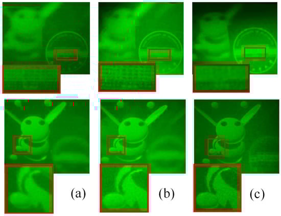 where r (u, v) is the reference plane wave with incident angle of 3° and r* (x, y) is the conjugation of r (u, v). C is a constant real value to make I(u, v) non-negative. Then the hologram is binarized by setting the mid-value as the threshold. The hologram contains 3600 × 3600 pixels with 5 µm pixel pitch. A solid laser with wavelength of 510 nm was used to illuminate the hologram after being collimated by a lens. Figure 6a–c show the reconstruction results with capturing depth L = 80 mm, 45 mm and 30 mm, respectively. It is easily confirmed that reducing L will always improve the reconstruction quality near the CDP (see the bee model). But to avoid the quality degradation at the marginal depth (see the school badge), a proper L should be chosen.