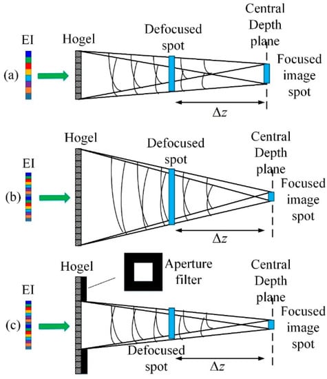 Figure 7a shows a typical case in which the pixel size Δx1 of EI equals the pixel size Δx2 of hogel. In Figure 7b, Δx1 is reduced and according to Equation (2), the hogel size p = NΔx2 is increased accordingly. Since the hogel size is larger than EI, the adjacent hogels will have overlap. It can be seen that the focused image spot at the CDP is decreased, making a better reconstruction quality near the CDP. However, the increased hogel size will cause wider light rays, making larger defocused spots away from the CDP. As a result, the depth range is decreased. To address this issue, an aperture filter is introduced to limit the width of the light ray in Figure 7c. The calculated complex amplitude distribution of each hogel is multiplied with a rectangle function Rect(u/p0)·Rect(v/p0), where p0 is the pitch of the EI. Then each filtered hogel can be spliced seamlessly. The aperture filter reduces the width of light rays, making better reconstruction qualities within the total depth range.
