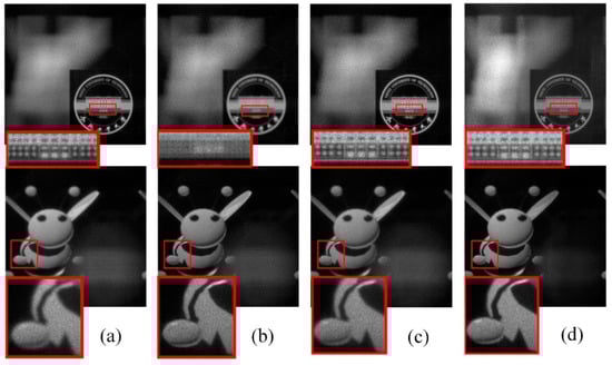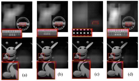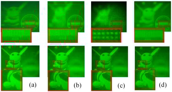 (a) Optical reconstruction results with focal length f = 3 mm. (b) Optical reconstruction results with focal length f = 6 mm. (c) Optical reconstruction results with focal length f = 6 mm and partial aperture filtering. (d) Optical reconstruction results with partial aperture filtering and MALT.