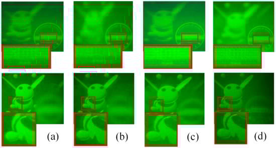 Figure 8a–c show three groups of numerical simulation results corresponding to the three cases in Figure 7. In Figure 8a, the parameters are set as p = 0.3 mm, f = 3 mm, Δx1 = Δx2 = 5 μm, L = 80 mm. The captured EIA consists of 60 60 EIs, each with 60 60 pixels. The CDP is set at the center of the bee model, and the distance between the school badge and CDP is set as Δz = 40 mm. In Figure 8b, Δx1 is reduced to 2.5 μm and each EI contains 120 120 pixels. The hogel size p is increased to 0.6 mm, so that adjacent hogels will have overlap. As a result, Figure 8b shows better reconstruction quality at the CDP (see the foreleg of the bee), but with degraded reconstruction quality of the school badge. It just verifies the above analysis that the increased hogel size will cause larger defocused spots away from the CDP. In Figure 8c, each transformed hogel is first multiplied with an aperture filter to reduce its size to 0.3 mm; then, all the filtered hogels are spliced seamlessly to form the final hologram. It shows the best reconstruction quality at the marginal depth (the school badge), and the reconstruction quality at the CDP is better than that in Figure 8a. A slight degradation at the CDP can be observed compared with Figure 8b. That is because the numerical filtering causes limited aperture diffraction. Since a spherical wave phase is multiplied with each hogel, the diffraction pattern at the CDP can be thought of as the Fraunhofer diffraction of the rectangular hogel. The zero-order diffraction contains the most energy, with width of 2λL/p. The zero-order diffraction width determines the upper limit of the resolution. The filtering process reduces the hogel size p, resulting in a degraded diffraction spot. To further improve the reconstruction quality within the total depth range, a partial aperture filtering technique is proposed here. That is, part of the EIs are converted to hogels without aperture filtering to ensure good reconstruction quality near the CDP, and the rest of the EIs are converted to hogels with aperture filtering to improve the reconstruction quality away from the CDP. This classification process can be easily realized in a simple 3D scene such as Figure 5a. The bee model and the school badge are located at the left-half and right-half spaces, respectively. Thus, the EIs mainly contributing to the two objects can be simply classified to the left half and the right half. Then, the left half EIs are transformed to hogels without aperture filtering, while the right half EIs are transformed to hogels with aperture filtering. It is noted that the reconstruction brightness is decreased due to the aperture filtering. Thus, to balance the brightness of the left and right halves, the calculated right half hologram needs to multiply with “2”. Through this simple classification, the negative influence of aperture filtering on the reconstruction near the CDP can be relieved, as shown in Figure 8d. Figure 9 shows the optical reconstruction results, which verify the conclusion in Figure 8.