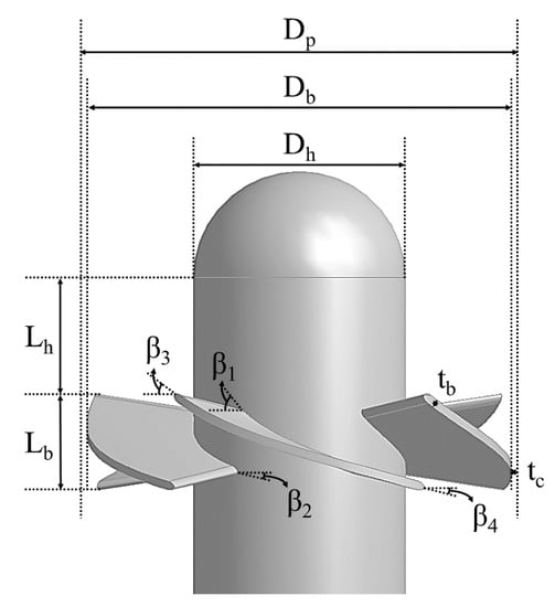 A reference model of the micro tubular propeller turbine was designed referring to the precedent study [35]. Figure 1 and Figure 2 show a system schematic and a runner model, respectively, and Table 1 describes the specification. The design of an in-line type hydro turbine while locating the generator outside of the flow path necessitates the use of bent pipes. The bend angle of the pipe is set to 45° to minimize the head loss inevitably generated.