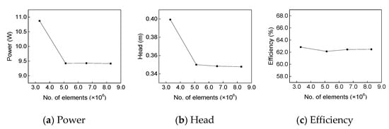 A grid dependency test was performed to minimize the effect of the grid size on the results, and consider the economics of the numerical analysis time. Figure 3 shows the results of the variation in the power, head, and efficiency represented in Equations (1)–(3) by the number of elements. The results show that those values do not change greatly from more than about 5 million grid elements. Therefore, the number of grid elements used in this study was set to approximately 5 million.