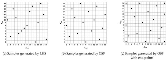 Design of experiments (DOE) was conducted to investigate the effect of the variation of the elliptic aspect ratios of the blade leading and trailing edge (see Figure 4) on the performance of the hydro turbine. The DOE is a method of logically analyzing the results, using statistical theory by efficiently placing experimental conditions, rather than performing experiments on all design variables within the range of the experimental area of interest. Unlike physical experiments, there is no random error in computational experiments; therefore, it is known that sampling methods which uniformly fill the experimental areas, the so-called “space-filling” concept, are appropriate [41]. Latin hypercube sampling (LHS) is a method of dividing each of the dimensions in the experimental design into regions with equal levels and extracting one sample from each region [42]. It is known to be a suitable sampling method for computational experiments, because it satisfies the concept of space-filling. One disadvantage of LHS is that it places samples randomly in the experimental area, hence it is likely that the distributed samples will be uneven. Optimal space-filling (OSF) is a sampling method based on LHS, but by maximizing the minimum distance between the points, it provides a more uniform distribution within the design space [43]. In this study, the design variables were sampled using OSF, and Figure 5b shows the distribution of extracted design variables within the experimental area. However, OSF does not include endpoints in the experimental area, which has the disadvantage of being less accurate at endpoints. Therefore, the samples for DOE added endpoints to the samples from OSF as shown in Figure 5c. The ranges of the elliptic aspect ratios of the blade leading and trailing edge were set to 2–16.