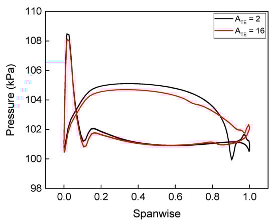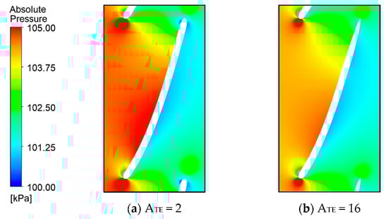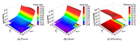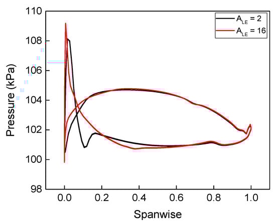 Figure 7 shows the generated response surface for sensitivity analysis of the design variables. The x-axis and y-axis represent the elliptic aspect ratios of the leading and trailing edge of the blade, respectively, while the z-axis indicates the power, head, and efficiency from left to right. Between the elliptic aspect ratios of the leading and trailing edge of the blade, the more sensitive design variable in terms of performance is the latter, and there is a tendency that as the blade edges sharpen, the power and head decrease. In addition, the response surface in the region of 2–4 for ALE is rather steep, especially for the efficiency. This can be considered for several reasons. Here, the figures used in the explanation are represented at 50% span which is the middle of the hub and shroud (see Figure 8). First, for the blunt leading edge (particularly ALE = 2 or 3), the flow separation occurs due to the strong adverse pressure (see Figure 9). This is because of the drastic change of curvature radius. Furthermore, the sharper the trailing edge, the more the flow separation is delayed (see Figure 10), and the lower the pressure on the pressure side (see Figure 11 and Figure 12). In addition, in the case of the leading edge, drastic variation of the pressure is inevitably formed due to the stagnation point, regardless of the change of the leading edge shape of the blade (see Figure 13). The sharper the leading edge, the greater the tendency of the drastic pressure fluctuation on the suction side to be resolved, but the more insignificant the overall pressure difference between the pressure and suction sides becomes (see Figure 14). Moreover, the results can be considered using the velocity triangle at the inlet and outlet of the blade. The water flows in a straight direction until just before the runner entrance, due to the absence of a guide vane. Figure 15 shows that the absolute velocity and blade linear velocity are perpendicular at the leading edge. Equation (7) indicates Euler’s turbine equation, which enables calculation of the theoretical turbine output based on Newton’s second law of motion [46]: