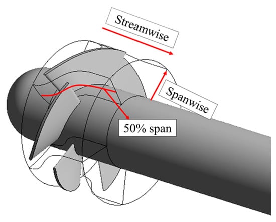 A numerical analysis was conducted using ANSYS CFX ver. 2020 R2, and Table 2 describes the boundary conditions applied in this study. Here, the inlet velocity, according to the inlet condition is 0.78 m/s and the Reynolds number, is 7.43 × 104, which indicates high turbulence. Due to the absence of a guide vane in this model, the water flows straight until just before the runner entrance. For this reason, the steady state with frozen rotor interface was set to an analysis state, because the flow is uniformly distributed to the blades, and there is no wake at the runner inlet. With respect to the turbulence model, shear stress transport (SST), which is known to be able to simulate the secondary flow at the blade [37,38], was selected to consider the effects of adverse pressure gradient on the blade.