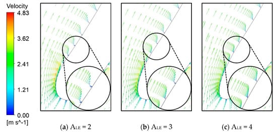 Velocity vector distributions at the leading edge at 50% span of the different elliptic aspect ratios of the leading edge (a–c).