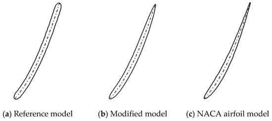 An airfoil refers to the cross-sectional shape of an airplane’s wings. In 1929, the National Advisory Committee for Aeronautics (NACA) studied a series of airfoils, and systematically standardized them to be suitable for specific conditions [49]. The NACA airfoils play a role in improving the aerodynamic performance of the airplane, and if applied to the hydro turbine blade, may be expected to stabilize the flow passing through the runner, and improve the performance of the hydro turbine. In particular, the maximum thickness of the NACA 4-digit series airfoil models is located at 30% of the chord from the leading edge [50]. This configuration has a similarity to the results previously derived from the optimization of the blade leading and trailing edge elliptic aspect ratios. Taking these into consideration, a NACA 4-digit series airfoil model was applied to the blade profile of the micro tubular propeller turbine, and numerical analysis was conducted to analyze and compare the performance with the reference model. The blade angle was set to be identical to the reference model. Based on the camber line, the NACA 0004 to the hub face and NACA 0006 to the blade tip were applied to keep the maximum thickness of 1.7 mm, which is the same as the reference model. Figure 16 compares the blade cross-sectional shape on the hub face of the reference, modified, and NACA airfoil model, while Table 5 describes the results of the numerical analysis.