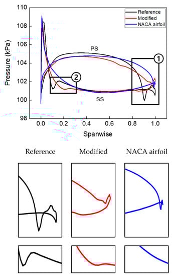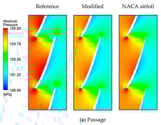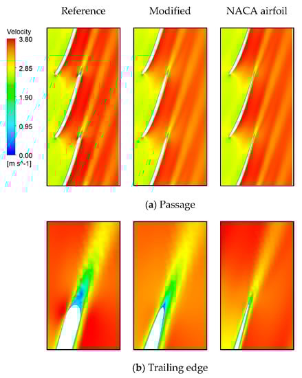 Figure 17 shows the pressure variation along the blade surface. The pressure fluctuation at the trailing edge is resolved for the modified model and the NACA airfoil model, compared to the reference model. In addition, the pressure variation line on the blade surface is the smoothest for the NACA airfoil model, so we can assume that the flow becomes stable. Furthermore, the flow becoming stable can also be determined through Figure 18, which shows the pressure distribution in the flow at the runner. In addition, as can be seen in the velocity distribution shown in Figure 19, the wake generated at the trailing edge is the weakest for the NACA airfoil, which results in the least influence from the wake.