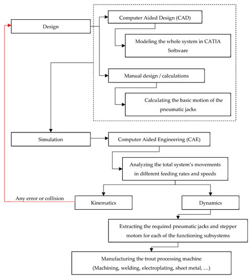 In the first step, the initial model was designed by CATIA software. Then, all parts, such as conveyor chain and gears, were defined by entering the exact dimensions of the parts in the software. To enable all fish-processing steps in the system, we considered the dimensions of the chassis: 2.8 m in length, 0.85 m in height, and a width of 0.7 m. The total design rationale is presented in Figure 3.