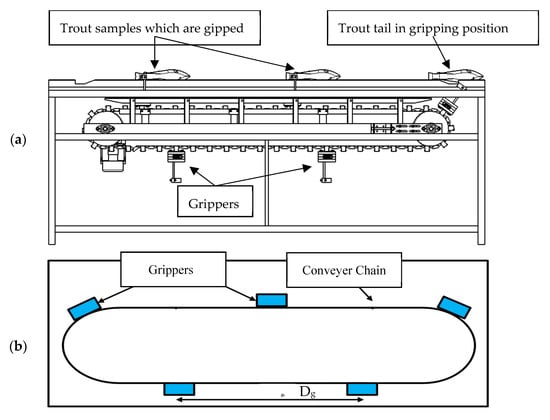 (a) System sketch, and (b) conveyor chain and the grippers with a distance “Dg” between the grippers.