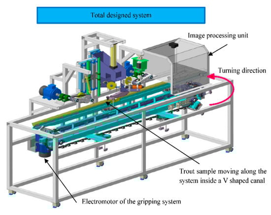 As shown in this table, by increasing the system capacity from four to 10 fish per minute, the linear velocity increased from 53.33 mm s−1 to 133.33 mm s−1. These values are the base inputs for design and simulation of the system. The complete design of the trout-processing system is presented in Figure 5. The subsystems of the machine are described in detail below.