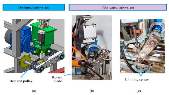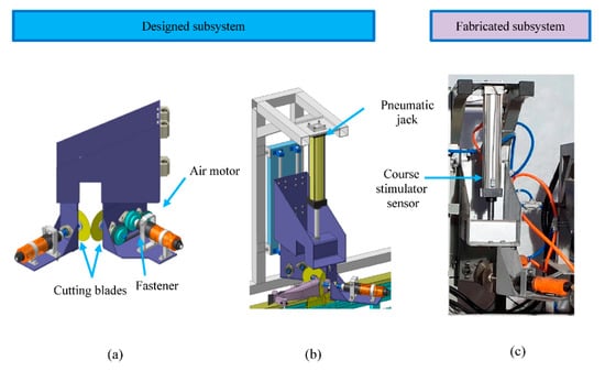 Belly-cutting subsystem: (a) designed subsystem, (b) fabricated belly-cutting components, and (c) limiting sensor.