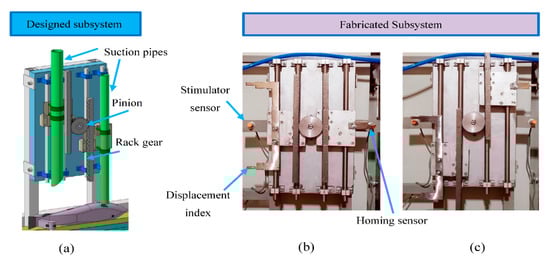 Gutting subsystem: (a) designed subsystem, (b) homing position with the applied sensor in the right side, and (c) functioning position with the limit sensors in the left side of the subsystem.